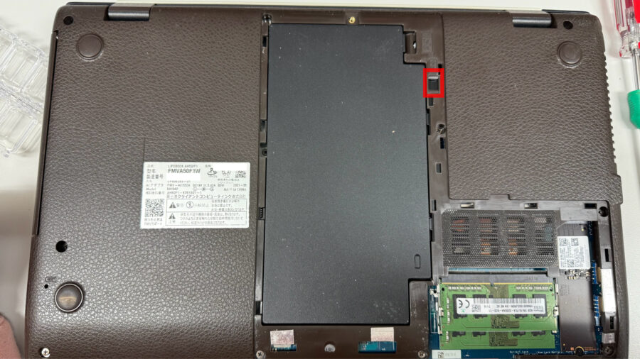 バッテリを覆っているカバーを外し、バッテリのロックを外すと取り出せます。