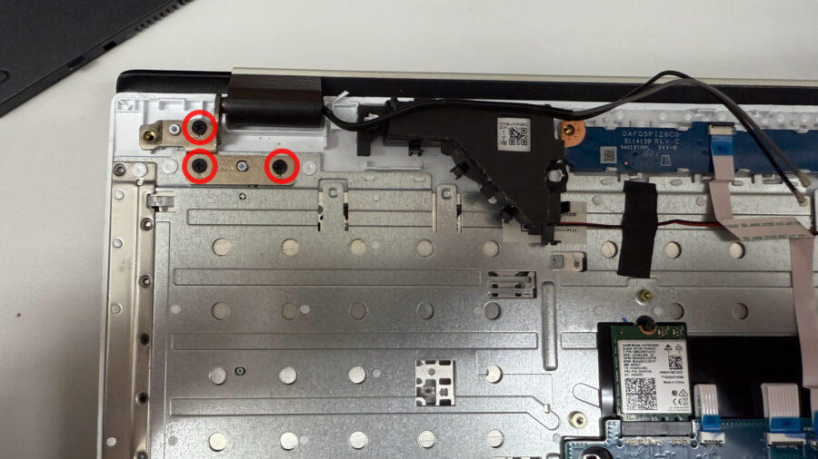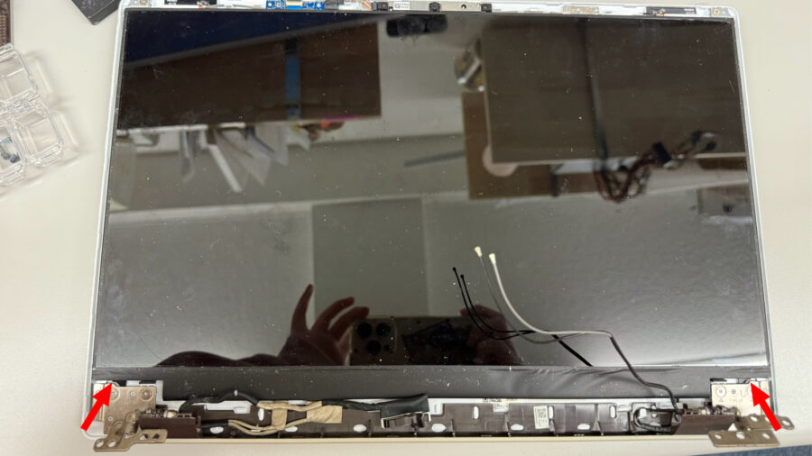 次に、左右のヒンジのネジをはずします。するとパソコンの上部分と下部分を切り離すことができます。