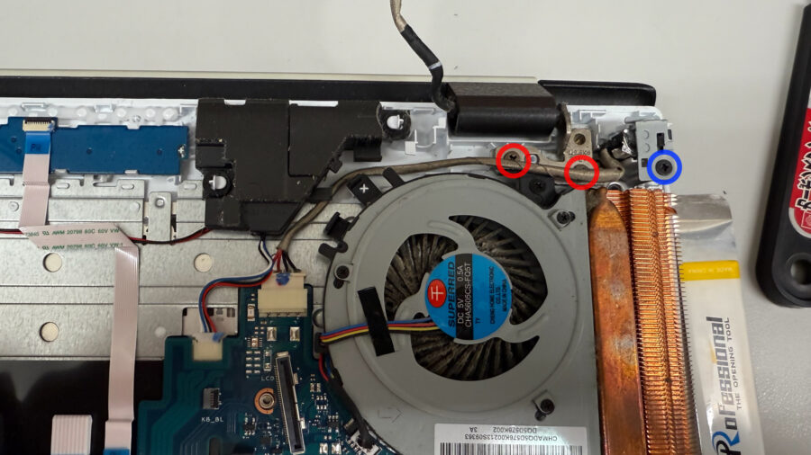 右側のヒンジを上に持ち上げる際に、充電ポートのコネクタが引っかかって邪魔な場合は、青丸のネジを回し、充電ポートを一時的に取り外すと良いです。