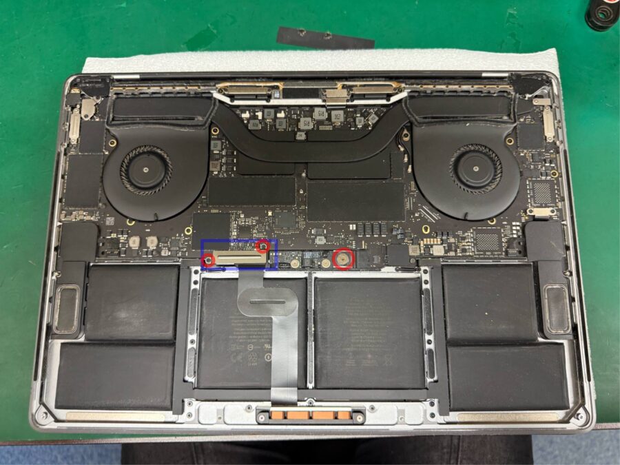 ロジックボードを外すために、囲っているネジとコネクタを外します👇